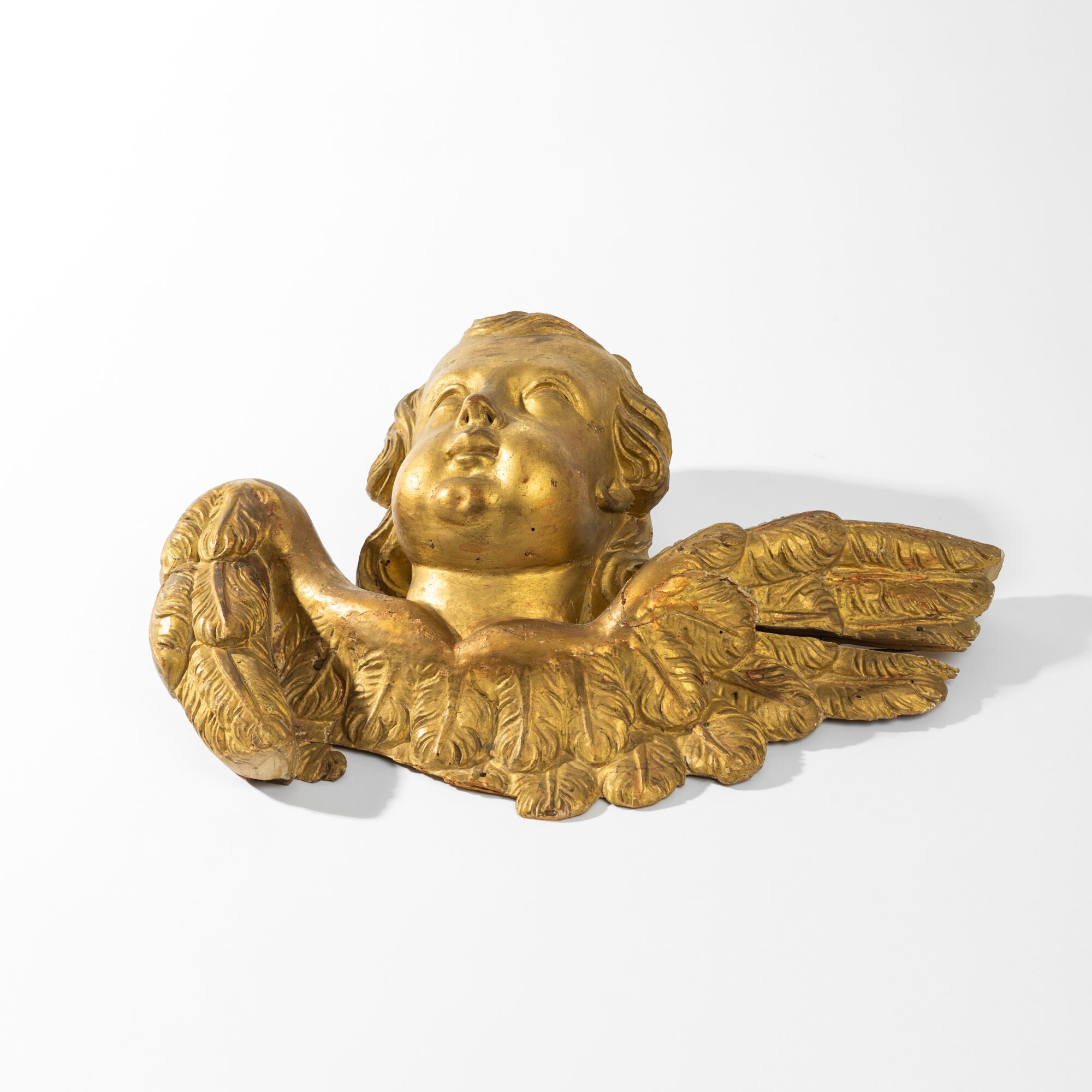 This angel sculpture is a timeless piece, aged, as evidenced by the rich patina of the wood and the subtle wear of the paint. Its beauty is undeniable, and it can be elegantly displayed on any wall.